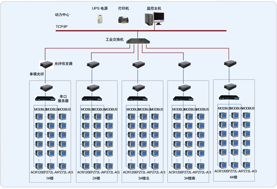 系統采用Acrel-2000型電力監控系統,整個系統采用網絡分布式結構,監控主機位于2#樓前面地下一層的動力中心中,其他5個配電室分別位于1#、2#、3#、4#地下一層(其中3#有南北兩個配電室),所有配電回路均配備安科瑞電力儀表PZ系列及ACR系列。該項目實現了淄博運動員公寓4個樓內電力系統的智能管理。所有監控設備均通過屏蔽雙絞線至各自配電室內的通訊管理機,再通過光電轉換器經過光纖將數據傳輸至2#樓地下一層的動力中心,從而實現遠程監控。