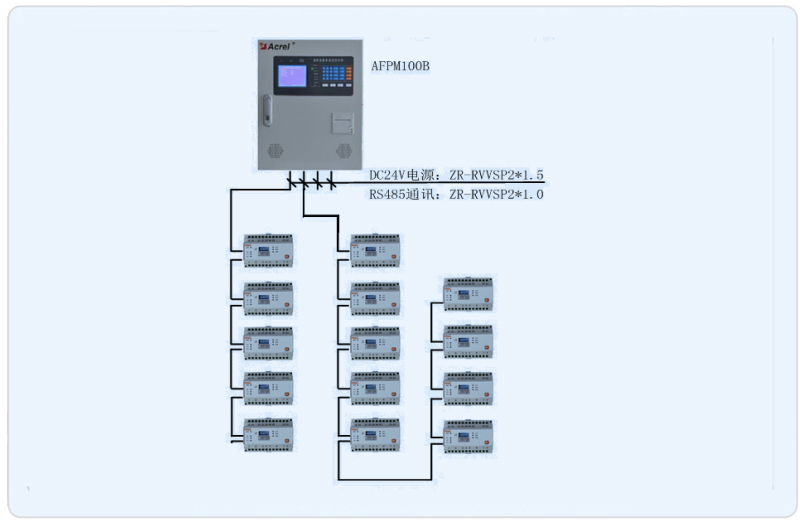 本項目承接其消防設備電源監控系統,通過對其樓層分布的20塊AFPM3-2AV型消防電源監控模塊的數據采集,完成在AFPM100主機的電壓狀態數據的實時顯示、報警。